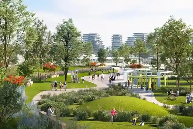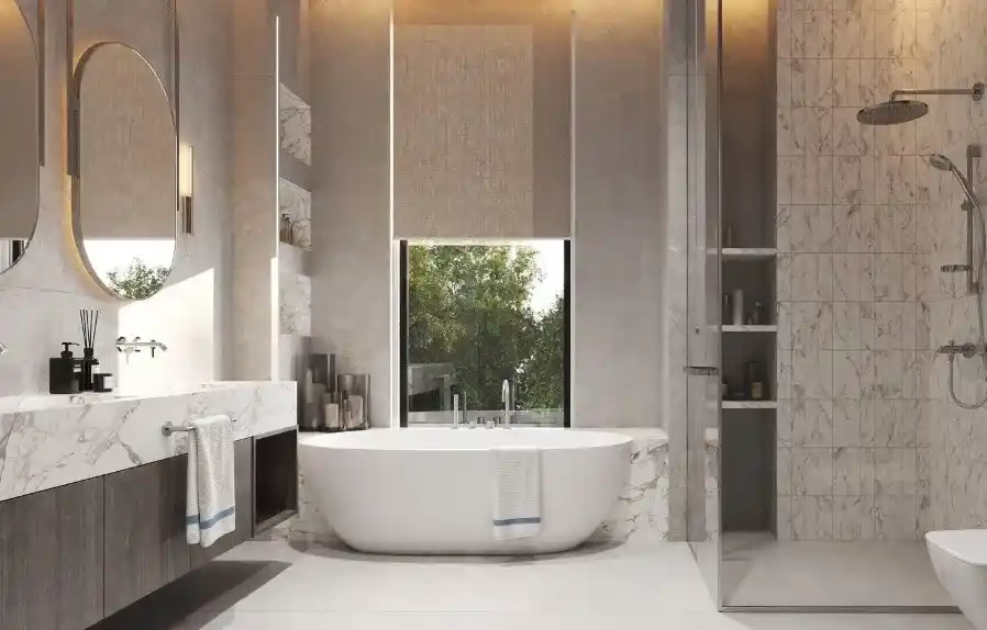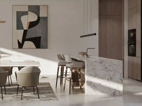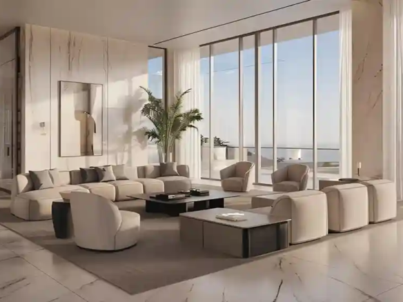 The architecture blends modern design with natural harmony, featuring stone facades, panoramic windows, and glass balcony railings that highlight the surrounding landscape. Interiors are finished in neutral tones, creating a calm and comfortable atmosphere, complemented by high-quality materials for a refined living experience.